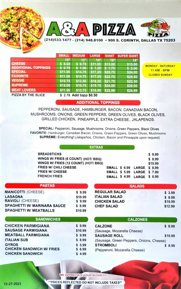 Introducing A&A Pizza, your new favorite pizza destination located at 900 S Corinth St Rd, Dallas, TX. Renowned for its flavorful offerings, A&A Pizza creates a culinary experience that keeps customers coming back for more. With a warm mom-and-pop vibe, the welcoming owners and excellent customer service enhance every visit.